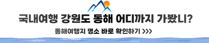 여름휴가를 앞두고 국내여행을 생각하시는 분들은 동해안으로 여행을 떠나보시는 것을 어떠신가요? 여름휴가를 어디로 가야 할지 정하지 못하셨거나 이번에는 국내여행을 가고 싶다고 생각하시는 분들은 꼭 집중해서 글을 읽어주세요! 요즘 뜨고 있는 동해안 여행지 BEST 6를 소개해드리겠습니다. 혹시 시간이 없으신 분들은 동해 관광에 대한 모든 것을 다 확인할 수 있는 사이트를 아래에 남겨놓을 테니 들어가셔서 필요하신 정보 꼭 얻어가세요! 일정별 코스, 인생샷 코스, 해안코스 등 쉽고 빠르게 찾을 수 있습니다!