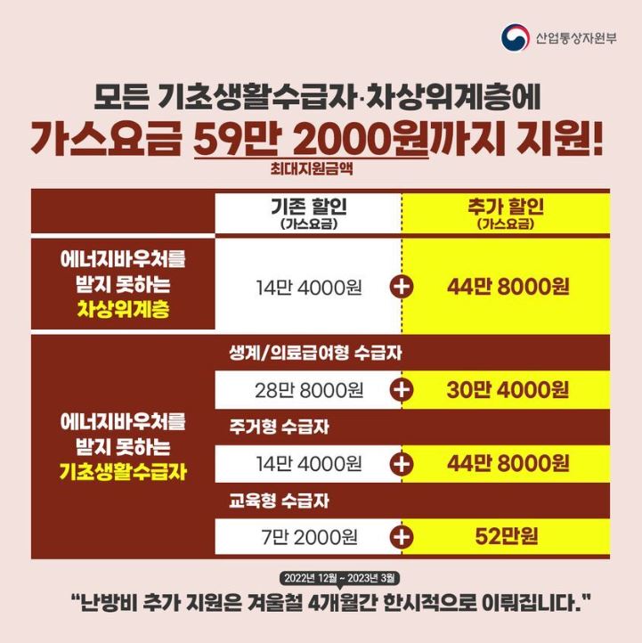 지난 26일 산업통상자원부는 에너지바우처 지원 금액과 가스요금 할인폭은 2배로 확대하는 지원대책을 발표했습니다. 이번의 지원은 동절기 2022년 12월부터 2023년 3월까지 4개월 동안 한시적으로 가스요금 할인을 지원해 준다고 하니 더 자세히 알아보도록 하겠습니다.