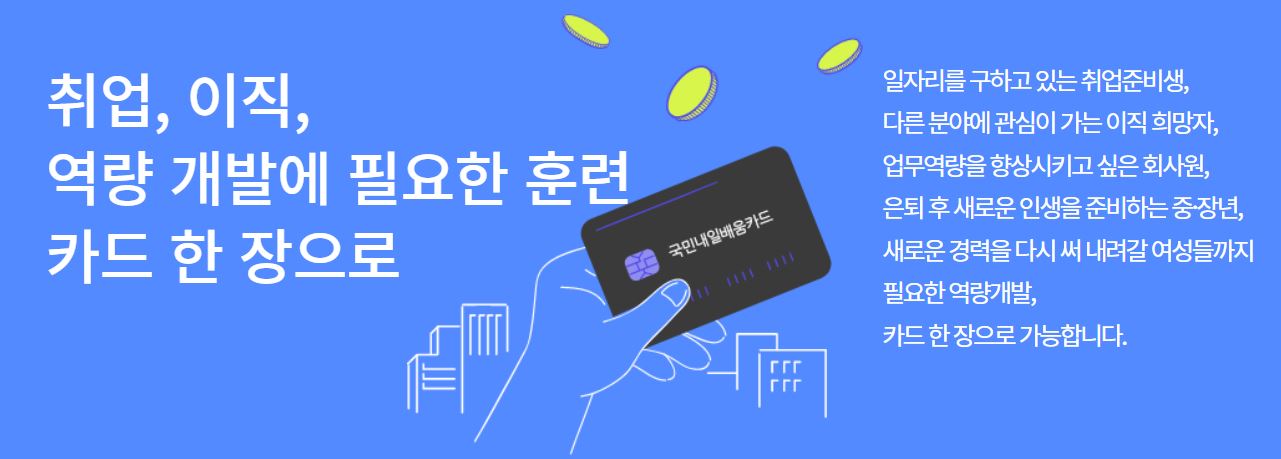 내일배움카드는 정부가 취업준비생, 재직자, 경력단절자 등을 대상으로 직업훈련비를 지원하는 제도입니다.