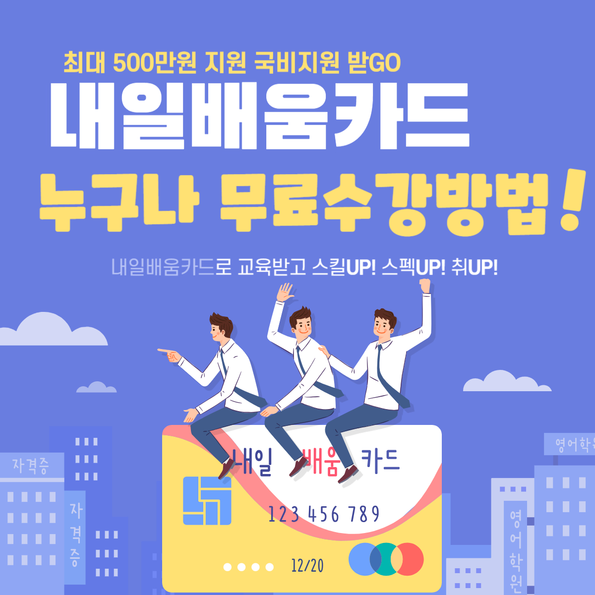 국민내일배움카드는 배움을 통해 경제적 능력을 갖출 수 있도록 하며 자신의 역향을 개발하고자 하는 사람들에게 국가에서 지원해 주는 정부가 지원하는 사업입니다. 최소한의 자비부담으로 배움을 얻을 수 있으며, 1년간 최대 300만원을 받을 수 있습니다. 더 자세히 알아보기 위해서는 아래 포스팅 글을 읽어주세요!