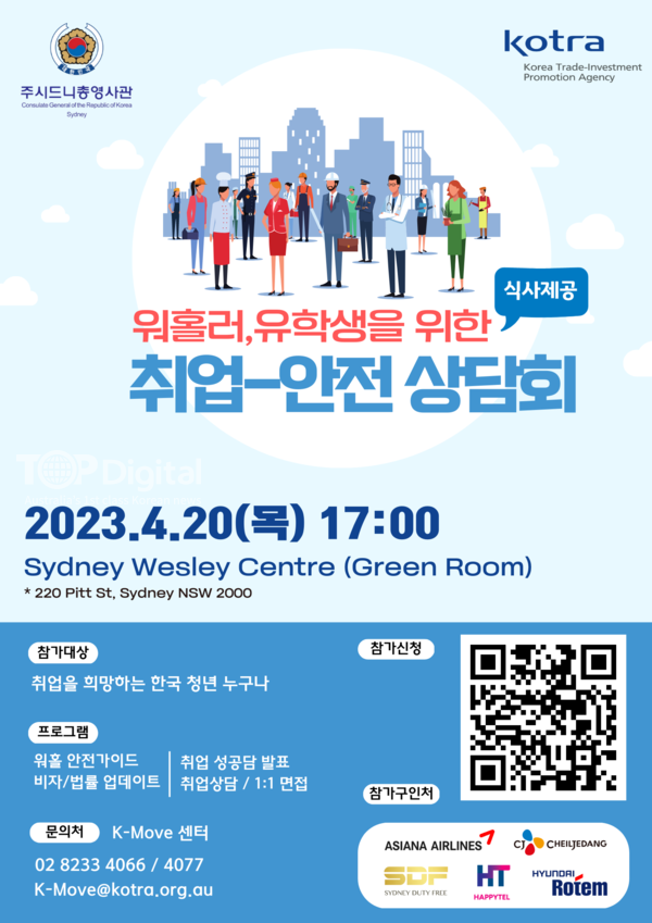 시드니총영사관과 코트라(KOTRA) 시드니무역관과 공동으로 진행하는 "호주 워홀러, 유학생을 위한 취업-안전 상담회"를 개최한다고 합니다. 주시드니총영사관에서 주최하는 거니 검증된 취업 상담회인만큼 취업비자나 취업에 관련된 모든 정보를 얻을 수 있습니다. 그러니 꼭 참여하셔서 취업 상담에 대한 기회를 가져가세요! 참고로 선착순 50명 모집이니 서둘러서 신청하셔야 합니다. 아시다시피 호주에 워킹홀리데이를 오시는 분들이 많아서 금방 50명이 마감될 수 있습니다. 신청을 먼저 원하시는 분들은 아래에 신청링크 바로 남겨드리겠습니다.