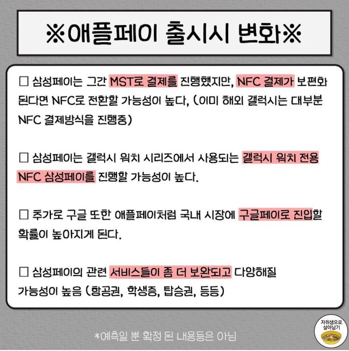 많은 분들이 아시다시피 이미 한국내에서도 삼성페이의 점유율이 압도적으로 높으며, MST(마그네틱보안전송) 위주의 결제 환경을 가져야 하기 때문에 애플페이가 상륙은 하지만 국내 공략은 아마도 쉽지 않을 것으로 보입니다.