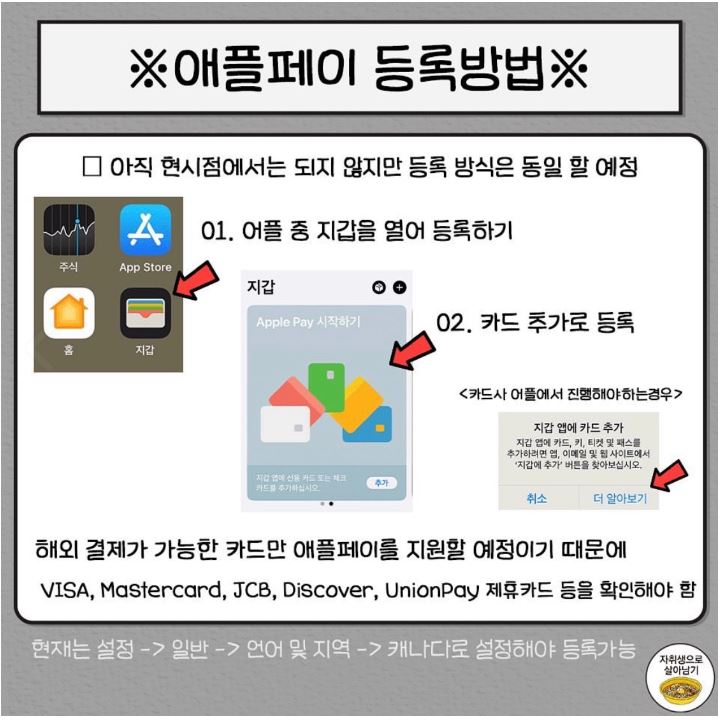 현재는 아이폰 '설정' - 일반 - 언어/지역 - 캐나다로 설정해야 등록이 가능한 상태입니다. 3월에 출시를 앞두고 있는 애플페이는 출시 전 iOS 운영체제 업데이트를 통해 이 부분을 업데이트 할 것으로 보입니다.