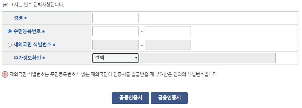 추가정보확인에 있는 "선택"을 클릭하시면 부 성명, 모 성명, 배우자 성명, 자녀 성명, 등록기준지 선택사항이 있습니다. 이 중에서 한 가지를 선택하여 입력합니다. 주민등록번호가 없는 재외국민이시면 필요에 따라 식별번호를 입력해주시면 됩니다. 그리고 난후 공동인증서를 클립합니다.