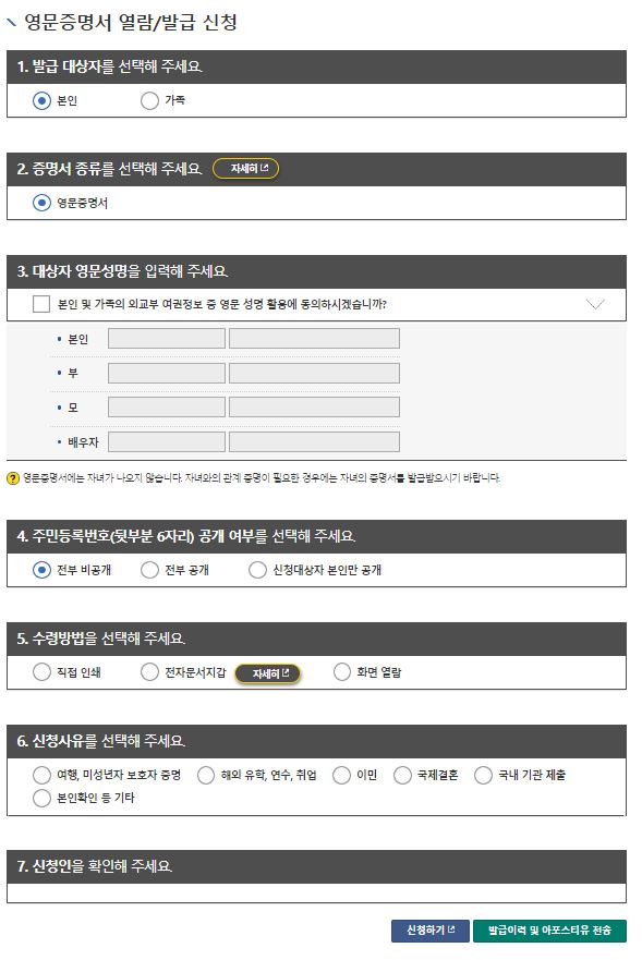 대상자 영문성명은 여권이 있으면 여권도 동일하게 입력합니다. 해외에서는 이름에 띄어쓰기 하나도 중요하기 때문에 여권과 동일하게 적는 것이 중요합니다. 혹시 가족 중에 여권이 없는 사람이 있다면 한국 여권영어 이름 표준법에 맞춰서 작성하시면 됩니다. 열람/발급 신청에 필요한 선택 사항들을 선택하시고 신청하기를 클릭합니다.