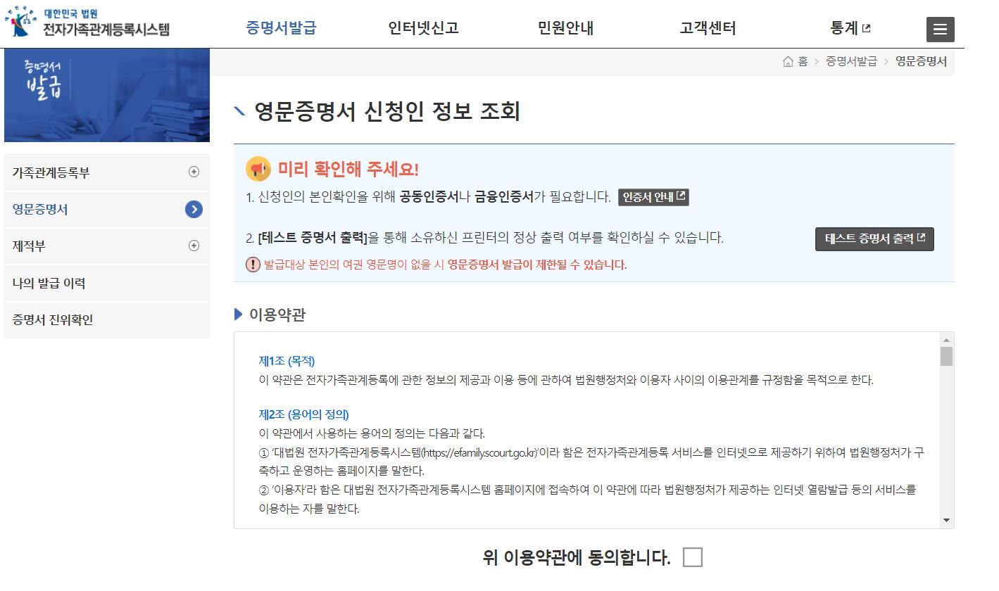 3. 영문증명서 신청인 조회에 관한 이용약관에 동의하셔야 합니다.