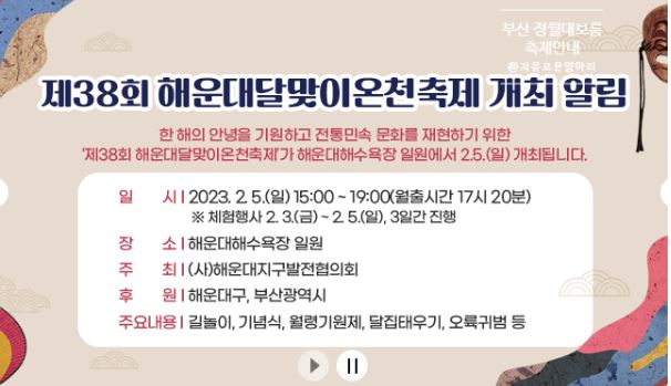 정월대보름을 맞이하여 부산에서는 해수욕장 등 9곳에서 2023년의 안녕을 기원하는 행사가 열립니다. 코로나 19로 인해 중단되었던 행사들이 4년 만에 개재 되었는데 그중에 하나가 부산 정월대보름 달맞이 축제입니다. 최근 들어 부산 엑스포 유치를 위해 부산시에서는 엄청난 노력을 하고 있습니다. 오늘 5일인 정월대보름 축제를 맞이하여 제38회 해운대 달맞이온천축제와 함께 2030 부산세계박람회 유치 관한 홍보도 같이 한다고 하니 정말 기대가 됩니다. 엑스포 유치 홍보를 같이 하기 때문에 오후 4시 '해운대 아리랑' 식전 공연 후, 2023 부산세계박람회 유치 휘호 붓글씨 퍼포먼스 등 다양한 것을 준비한다고 하니깐 놓치지 마세요!