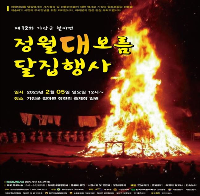 행사내용: 소망포쓰기, 무형문화재공연, 지신밟기, 고사 지내기, 무료 차 나눔, 달집 태우기 등