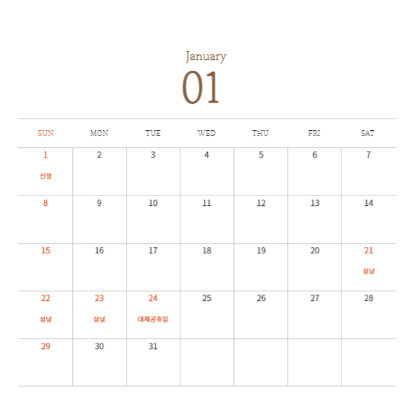 - 1월: 신정 1일, 설 연휴 21일~24일