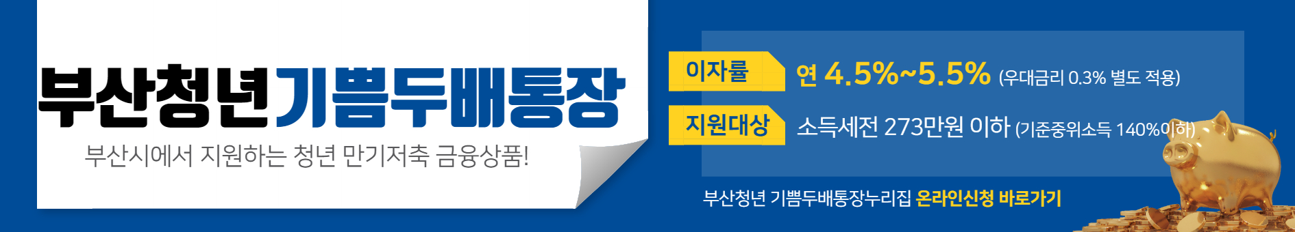 부산청년 기쁨두배통장은 부산광역시 거주자들을 대상으로 진행되는 정부사업입니다. 540만원을 저축하면 1,110만원과 함께 연 이율 4.5%의 혜택을 주는 적금통장 사업이며, 부산 청년들을 모집합니다. 청년들이 저축을 할 수 있도록 지자체에서 도와줌으로써 청년들의 경제활동에 도움이 주고자 하는 취지에서 이뤄진 사업입니다.