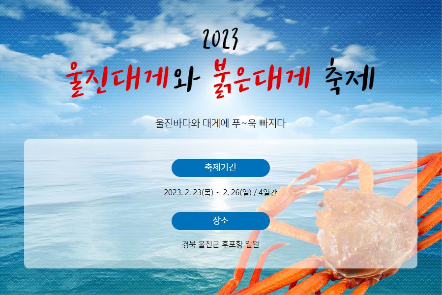 2023년 2월 23일 목요일부터 2월 26일까지 4일간 경북 울진군 후포항 일원에서 울진대게와 붉은 대게 축제가 열립니다. 코로나로 인해 축제가 취소가 되었었는데 이번에는 축제를 진행한다고 합니다. 울진대게와 붉은대게 축제뿐만 아니라 울진의 맛집이나 명소도 많으니 놓치지 마세요! 축제를 통해 대게를 저렴하게 맛볼 수 있도록 하는 것이 축제의 목적이니만큼 저렴하게 대게를 맛봅시다.