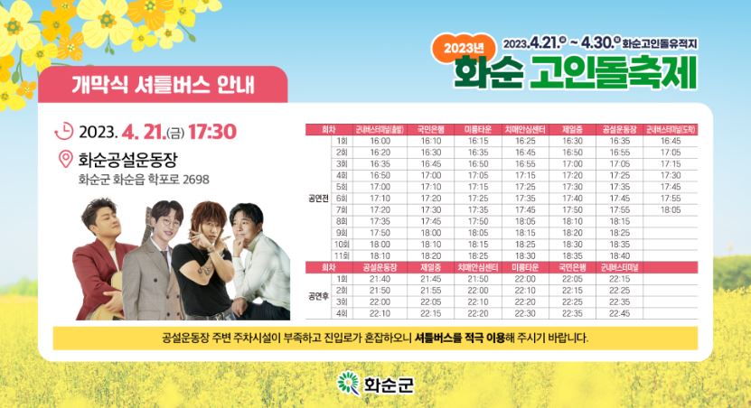 올해 축제 주관을 화순군에서 직접 하다 보니 엄청난 축하공연 무대가 기다리고 있습니다. 인기 있는 분들은 다 데리고 왔다고 해도 과언이 아닐 정도로 정말 기대가 됩니다.
