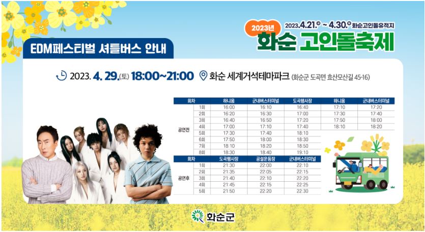 화순고인돌 축제가 4월 21일 금요일부터 4월 30일 일요일까지 총 10일간 열립니다. 작년까지는 도곡면면인 주 소재지에서 주관했지만 올해부터는 화순군에서 직접 주관하기 때문에 축제를 알리는 라인업 또한 엄청납니다. 축제 안에 축제가 있는 화순군 고인돌 축제에 함께 하세요! 화려한 개막식이 1부와 2부로 나눠지며, EDM 페스티벌, 반려동물과 함께할 수 있는 펫 페스티벌, 유적지에서 펼치는 국제학술대회, 남도전국가요제까지 모든 일정을 총정리 해드리겠습니다.