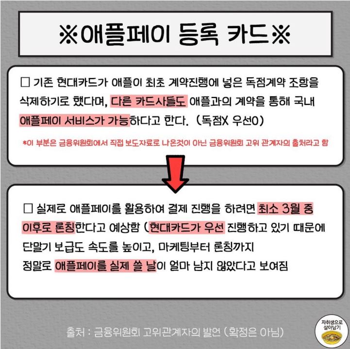 국내 파트너였던 현태카드에서 애플페이와 관련한 서비스를 먼저 출시할 것으로 보이며 다른 주요 카드사들도 이에 따라 가세할 전망이라고 합니다.