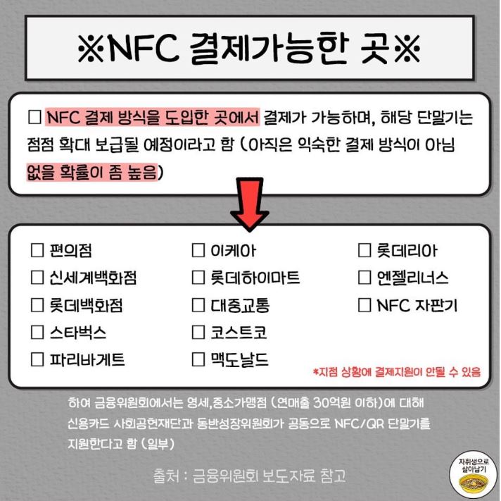 현재 전국 편의점, 신세계 백화점, 롯데백화점, 스타벅스, 코스트코, 이디야 등 대형 가맹점은 NFC 단말기를 구비하고 있기 때문에 애플페이를 사용할 수 있습니다. 또한 연 매출 30억원 이하인 영세, 중소 가맹점도 NFC단말기 지원금을 받아서 설치하고 있다고 하니 점차 많은 곳에서도 사용이 가능할 것으로 보입니다.