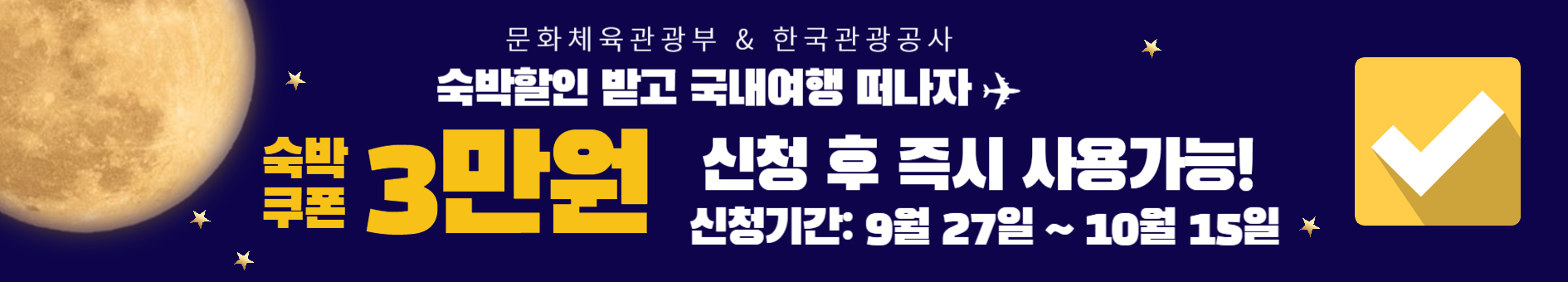 문화체육관광부가 한국관광고사와 함께 추석 연휴를 맞이하여 숙박할인권은 30만을 선착순으로 배포한다고 합니다. 또한 11월에 한번 더 배포할 예정이라고 하니 기회 놓치지 마세요! 흔히 알고 있는 유명한 여행사 및 호텔▪콘도▪모텔 등 다양한 국내 숙박시설을 이용하실 수 있습니다. 혹시 국내여행 계획이 있으신 분들은 숙박쿠폰을 신청하셔서 3만 원 혜택을 꼭 받아 가세요!