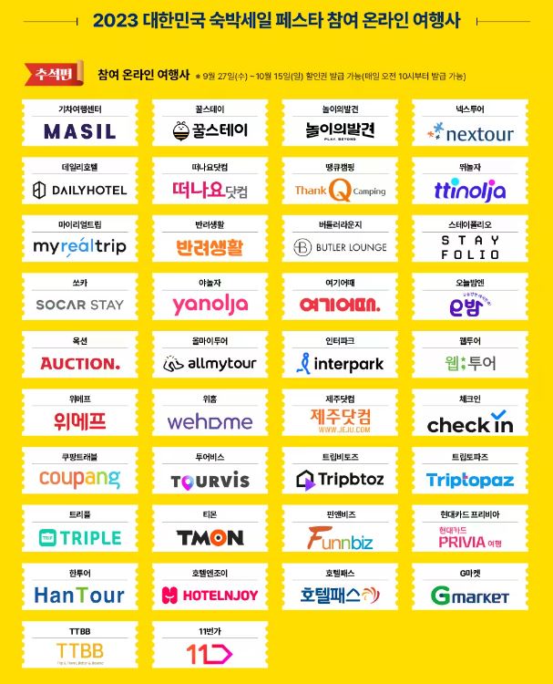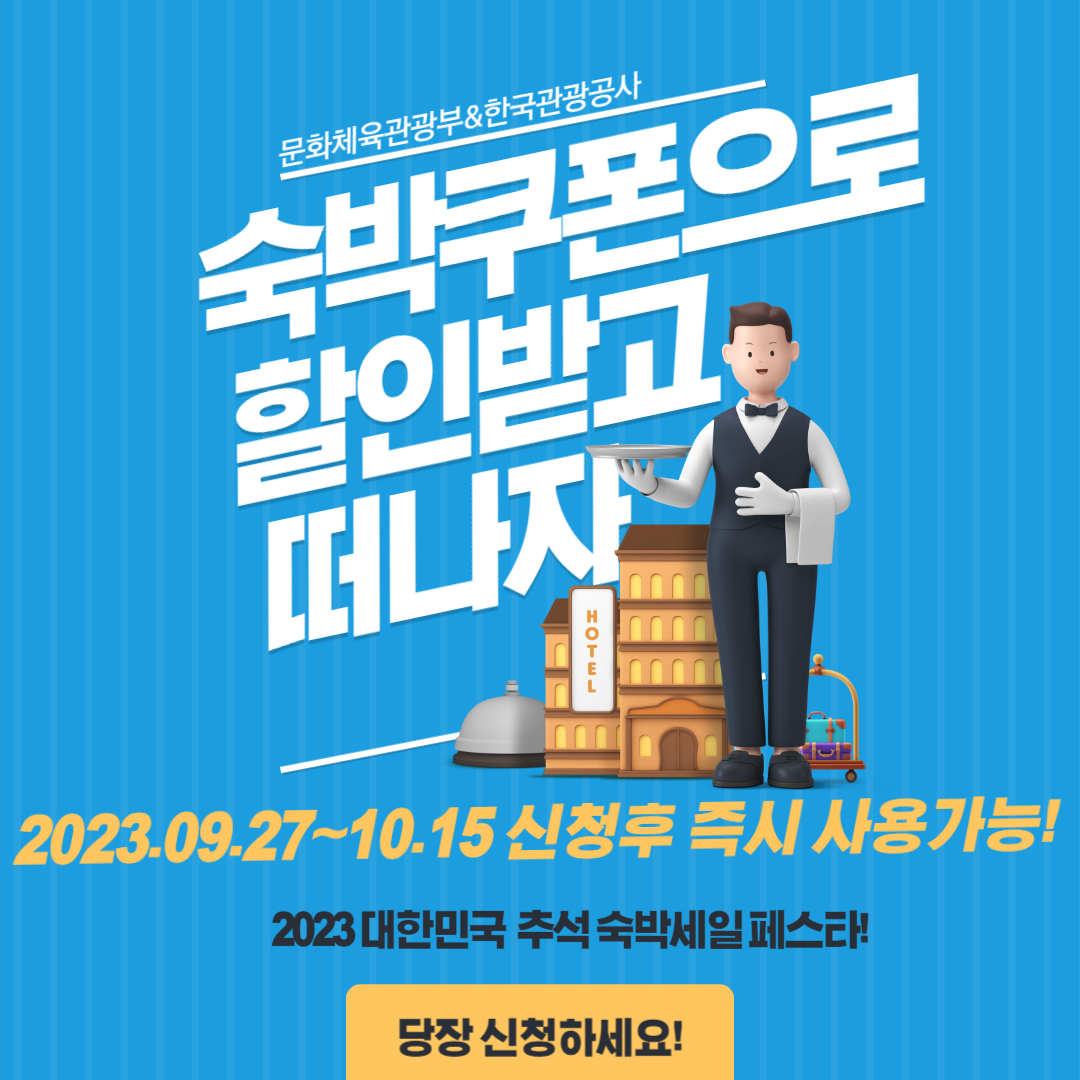 이번 2023 대한민국 숙박세일 페스타 쿠폰은 9월 27일 수요일부터 10월 15일 일요일까지 발급 및 사용이 가능합니다.