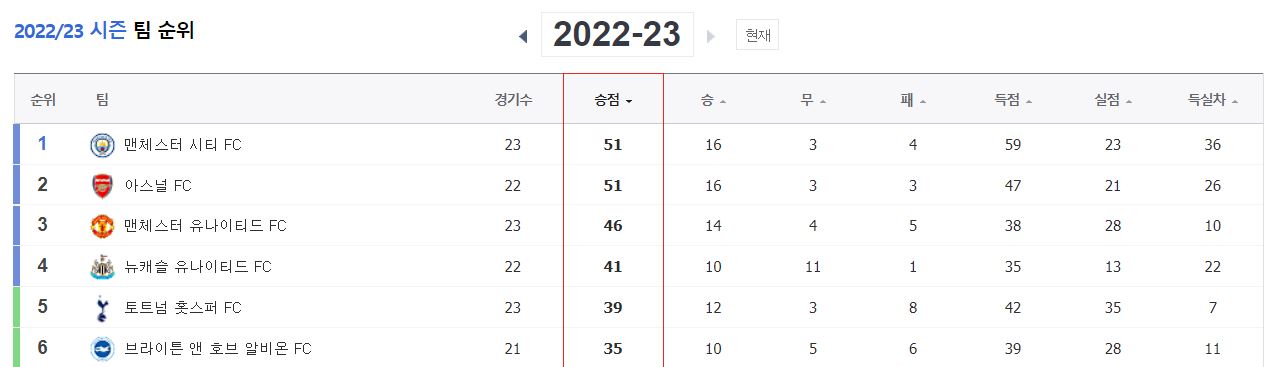어제까지만 해도 1위 아스널이 브렌트포드와 무승부를 기록하였고 맨시티와 맨유가 그 뒤를 바짝 쫓고 있습니다. 16일인 오늘 맨시티는 아스널과의 리그 원정에서 3-1로 승리를 하게 되면서 승점 3점을 획득했습니다. 이로서 아스널과 승점이 51로 동률을 이뤄냈으며 또한 골득실에서 선두로 올라 1위를 차지했습니다. 어제까지만 해도 1위를 유지하고 있었던 아스널은 1위를 내줬으며 올시즌 홈 무패 기록도 깨졌습니다. 앞으로의 아스널과 맨시티의 순위싸움이 더 치열할 것으로 예상됩니다.