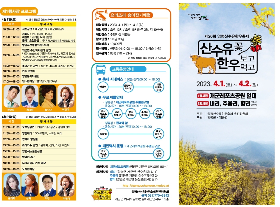 아름다운 산수유꽃과 맛 좋은 한우가 함께하는 양평 산수유 한우 축제. 눈으로 꽃을 즐기고 입으로는 한우를 즐길 수 있는 축제가 바로 이 축제입니다. 또한 초대가수 공연으로 장민호 님이 나오신다고 하니 아주 기대가 됩니다.