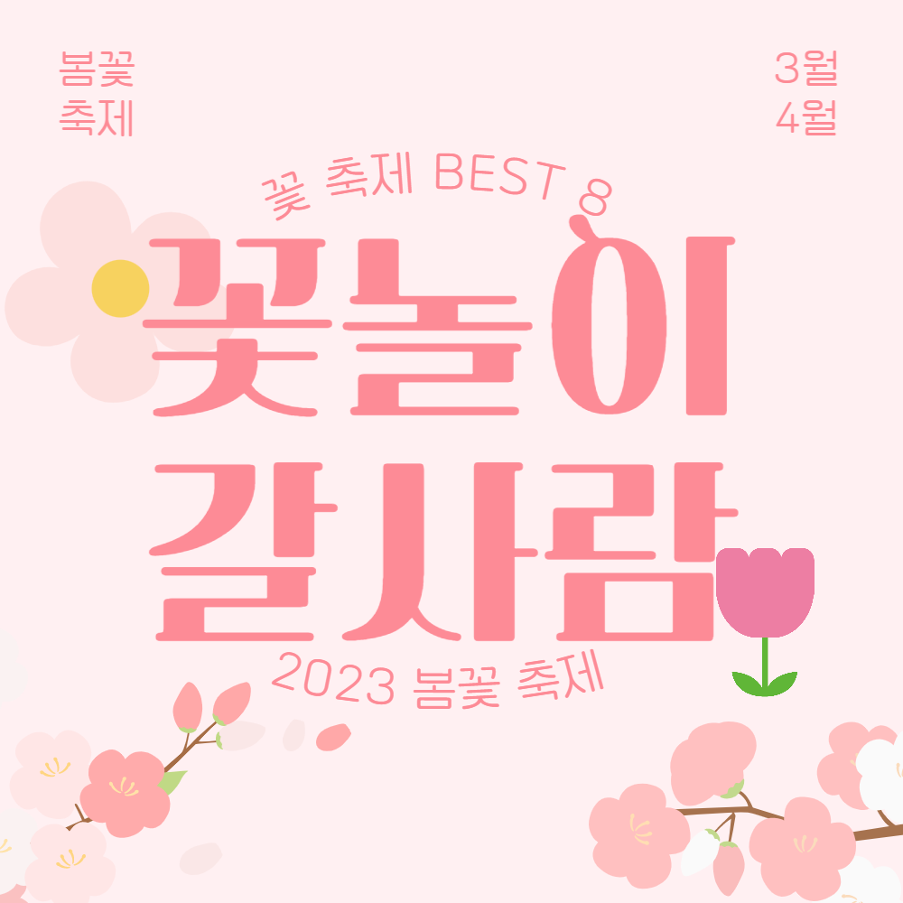 봄이 오면 함께 봄을 맞이할 수 있는 것, 바로 봄꽃입니다. 꽃들이 하나둘씩 꽃잎을 펴내면서, 겨울 추위와 우울함을 날려버리는 것 같습니다. 그리고 이 봄꽃 중에서도 꽃들이 가장 많이 피어나는 시기는 3월과 4월이죠. 이 두 달 동안 한국 곳곳에서 열리는 다양한 봄꽃축제들이 있습니다. 그중에서도 제가 추천하는 BEST 8을 소개해드리겠습니다. 참고로 축제기간이 시작되는 시기에 맞춰서 순차적으로 정리했다는 점!