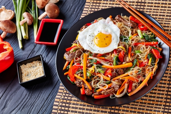 Japchae is a popular Korean dish made with glass noodles(also known as sweet potato noodles), vegetables, and meat. However, there are also vegetarian and vegan versions of the dish avaliable, which replace the meat with other plant-based proteins or simply omit it altogether. The dish is versatile and can be customized to suit individual dietary preferences and tastes.